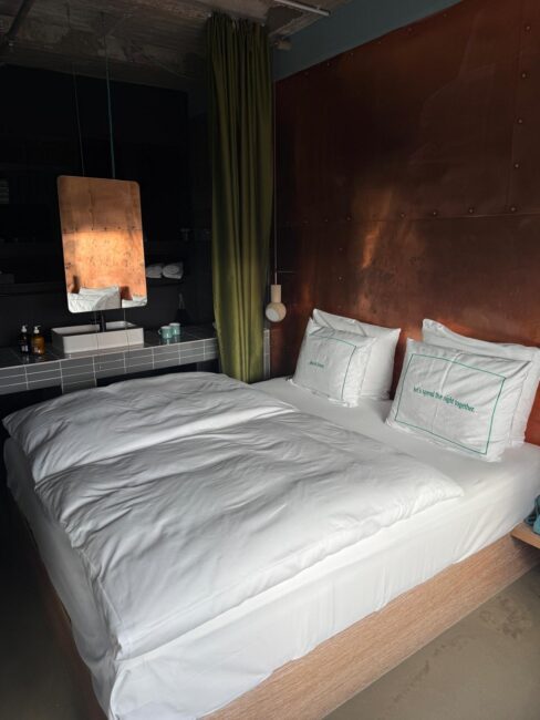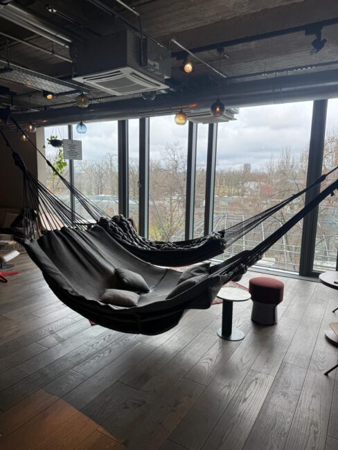 Was uns beim ersten Besuch sofort begeistert hat und auch heute noch begeistert, sind die Zimmer. Viele Zimmer im 25hours Hotel Bikini Berlin * haben eine Hängematte direkt am Fenster. Ein kleines Detail, das aber perfekt zu diesem kreativen Hotel passt. Nach einem langen Tag in der Stadt einfach kurz in die Hängematte legen, Musik hören und entspannen. Genau solche Momente machen einen Städtetrip besonders. Die Zimmer sind modern, warm und voller liebevoller Designideen. Viel Holz, natürliche Materialien und ein Stil, der gleichzeitig urban und gemütlich wirkt.