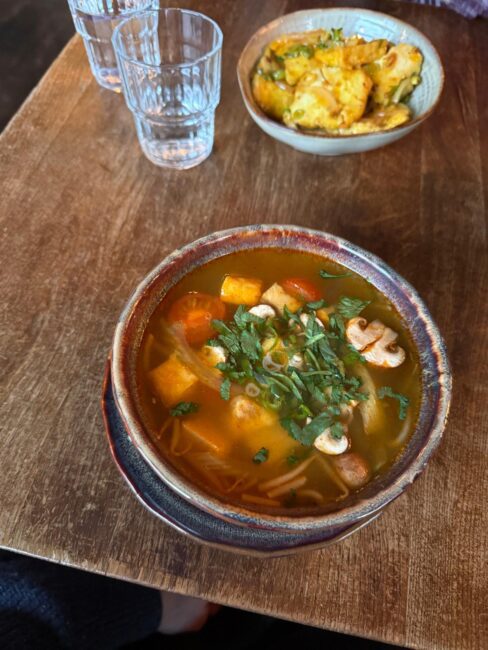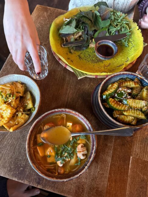 Neben Tofu spielen auch frische Kräuter eine große Rolle. Koriander, Minze, Limette und Zitronengras sorgen für diese typischen Aromen der vietnamesischen Küche. Die Gerichte wirken dadurch leicht, frisch und trotzdem unglaublich aromatisch. Viele Gäste bestellen mehrere Gerichte und teilen sie am Tisch. So kann man möglichst viele Kombinationen probieren.