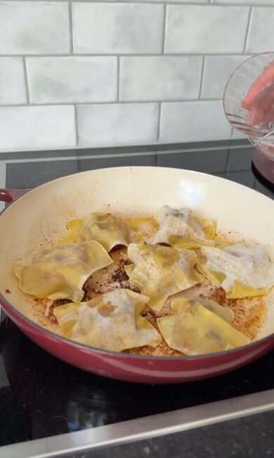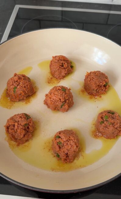 In einer Pfanne erhitzt du etwas Olivenöl und brätst die Bällchen von beiden Seiten kurz an. Danach legst du die Wan Tan Blätter einfach über die Bällchen, gibst etwa 150 Milliliter Wasser dazu und lässt alles so lange ziehen, bis die Blätter weich sind. Genau das macht diese Lazy Dumplings so entspannt, weil du sie nicht aufwendig falten musst.
