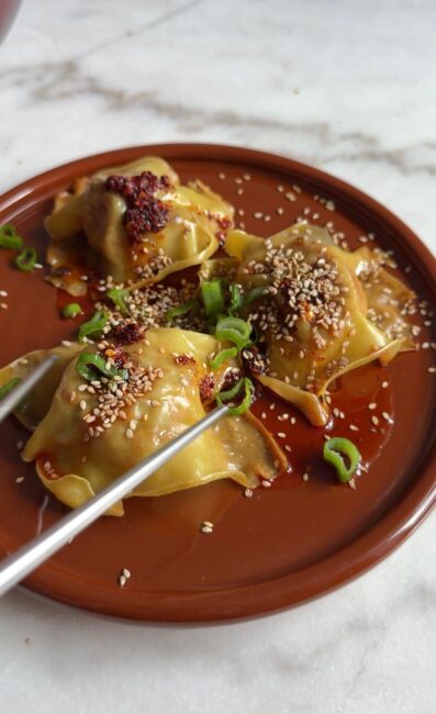 Wenn du magst, kannst du die Dumplings am Ende nochmal kurz ohne Wasser anrösten, damit sie außen leicht knusprig werden. Für mehr Schärfe einfach etwas mehr Chiliöl verwenden oder das Rezept nach deinem Geschmack anpassen.